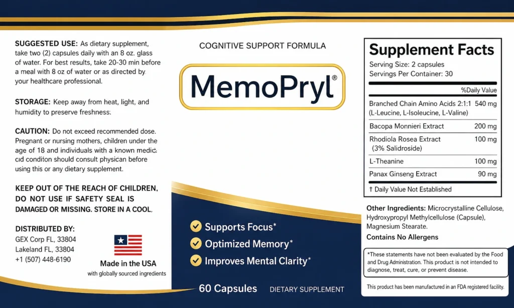 MemoPryl™ is a dietary supplement developed to support cognitive function, mental clarity, and overall brain performance. It is designed for individuals looking to improve focus, memory, and daily mental performance without relying on extreme or artificial solutions.